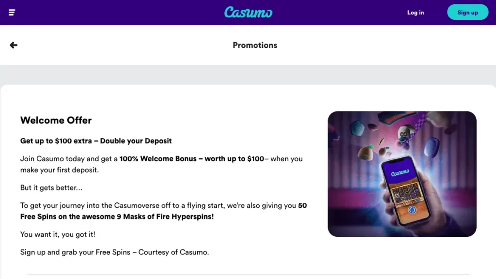 Casumo Casino offers a welcome bonus of $100 and 50 free spins for new players. To claim the bonus, you need to make a minimum deposit of $10. The bonus comes with a 30x wagering requirement before you can withdraw any winnings.
